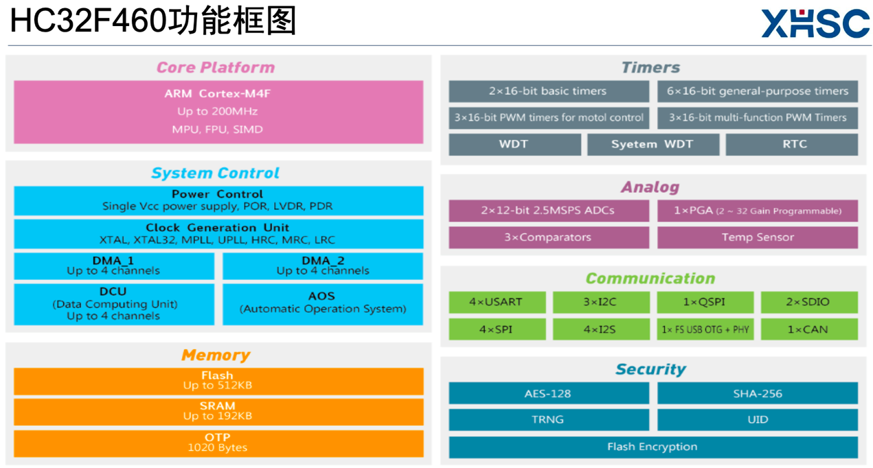 在电池储能系统的通信管理板的应用中,小华HC32F4A0 MCU以高可靠性、大容量 Flash、高安全架构的特点,已在行业内成功推广,下图为HC32F4A0功能介绍框图。